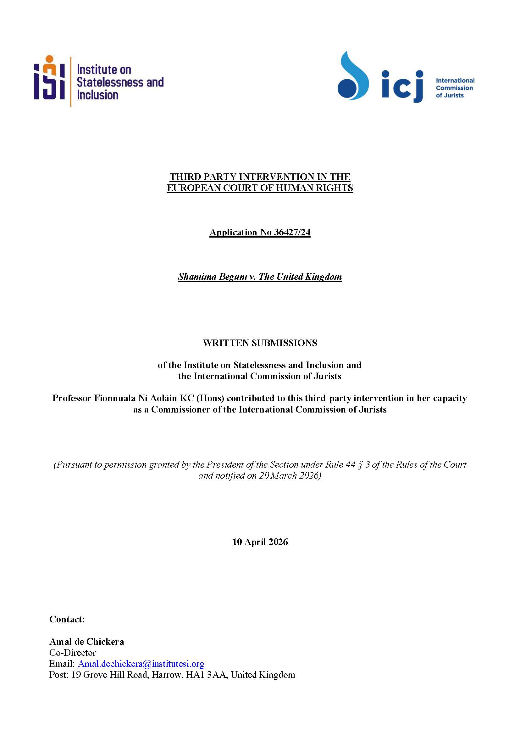 On 10 April 2026, the Institute on Statelessness and Inclusion (ISI) and the International Commission of Jurists (ICJ) filed a joint third-party intervention in the landmark case before the European Court of Human Rights (ECtHR), Shamima Begum v. the United Kingdom, making submissions on critical human rights concerns arising from trafficking, citizenship deprivation, and State responsibility under the European Convention on Human Rights (ECHR).